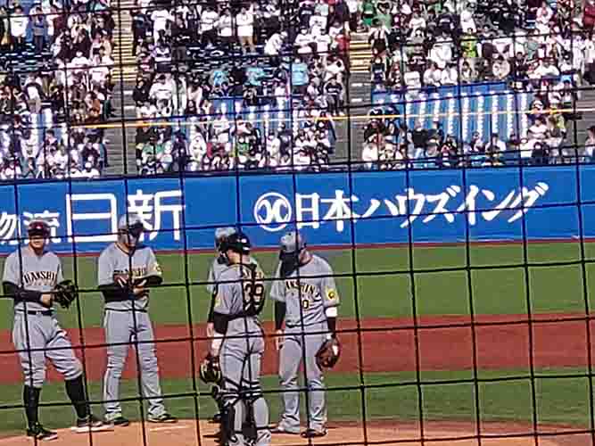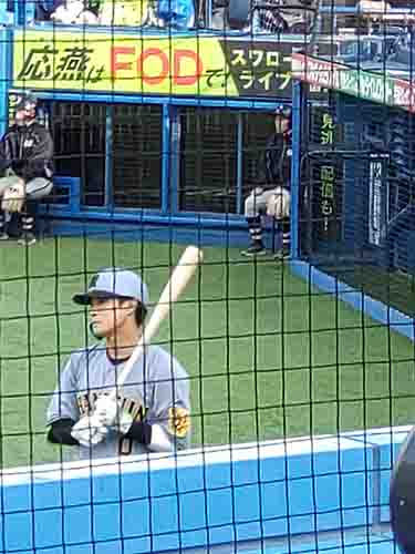 3塁ベンチ上の席で、周囲は関西からの遠征組が多い。